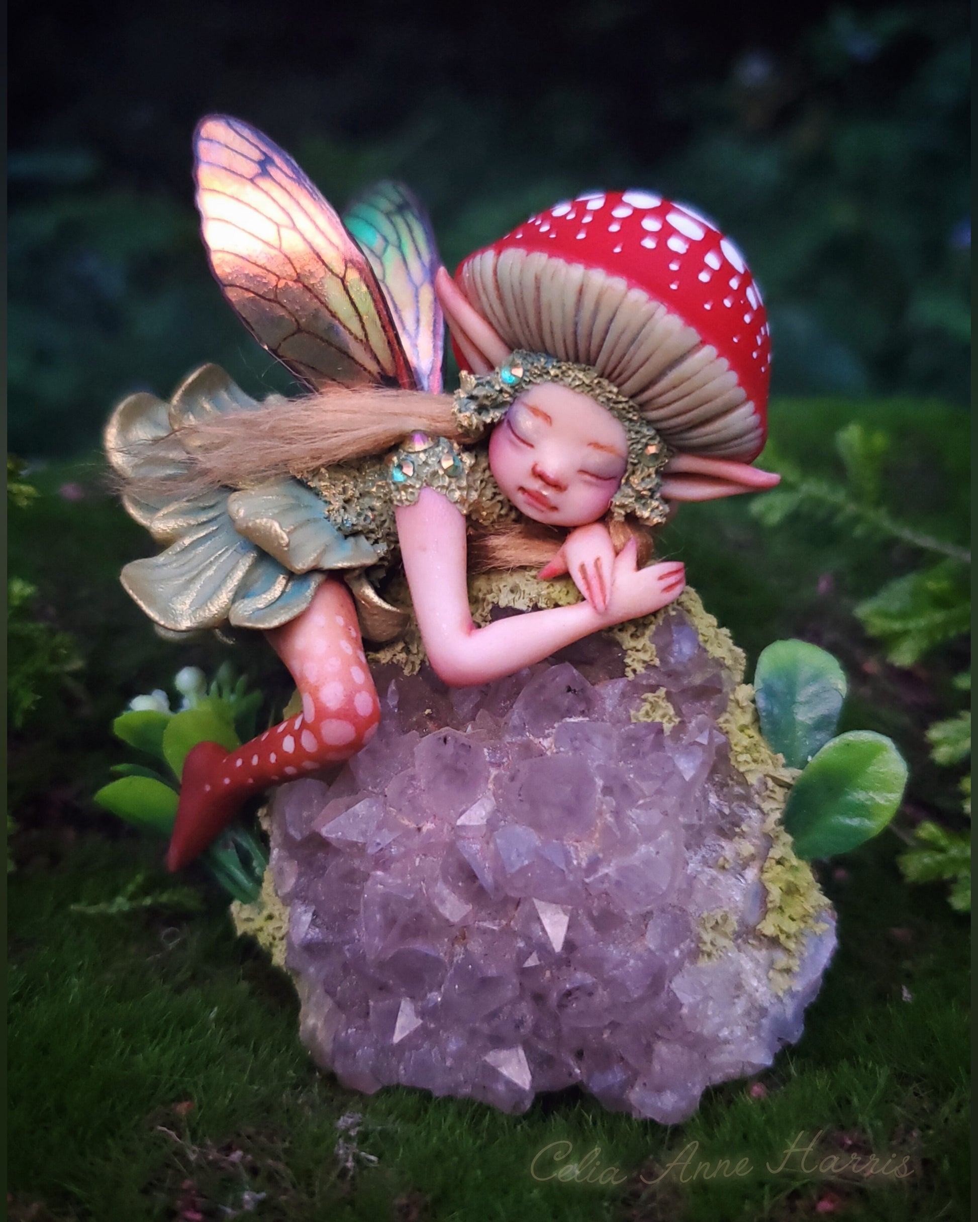 This little mushroom fae is sculpted from polymer and air dry clays, iridescent powders and hand sculpted leaves with iridescent faux insect wings. She sleeps on a genuine Amethyst crystal cluster base which she is removable from. π§βοΈπ±ππππ·πΏΒ Each of my little ones have been meticulously sculpted from scratch with polymer and apoxy clays and decorated with hand dyed flower petals, silks and cotton, hand made crystals, Swarovski crystal Rhinestones and iridescent wings. π₯°πΏππππ±π§βοΈ